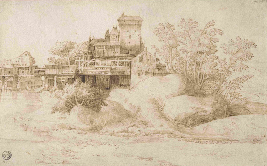 Giulio Campagnola Mulino presso un fiume penna su carta bianca cm 16,1x26,3 Firenze, Gabinetto dei Disegni e delle Stampe degli Uffizi